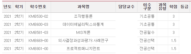 1학기 수업은 전공이지만 상대적으로 친숙한 수업을 선택해서 새로운 것을 배우 것보다 학부 때 배웠던 것을 다시 상기(想起)시키는 것이 많았다면, 2학기 수업은 실무에서는 매일 혹은 자주 다루고 있지만 이론적으로 배운 적이 없는 강의를 선택한 덕분에 강의 내용을 잘 흡수할 수 있었던 것 같다.