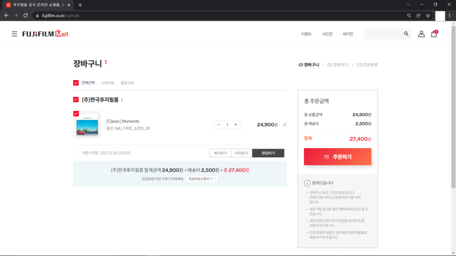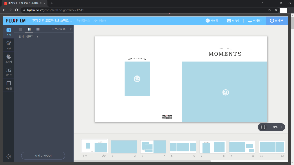 - 후지필름 포토북 Classic Moment 8x8 20 페이지 기본 구성 기준 사진 49장 필요