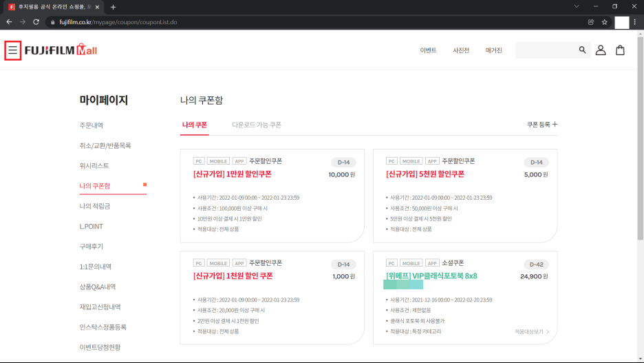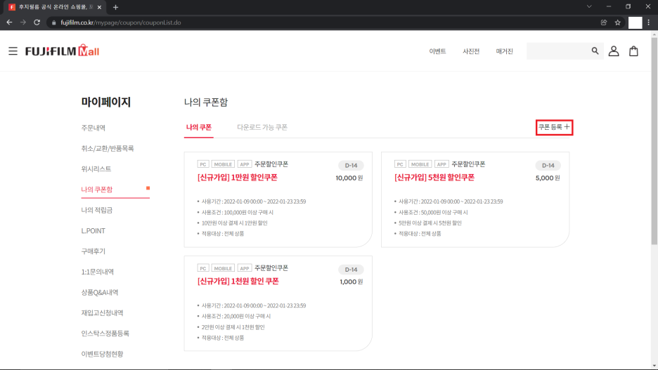 5. 마이페이지 - 나의 쿠폰함 에서 쿠폰 등록된 것 확인