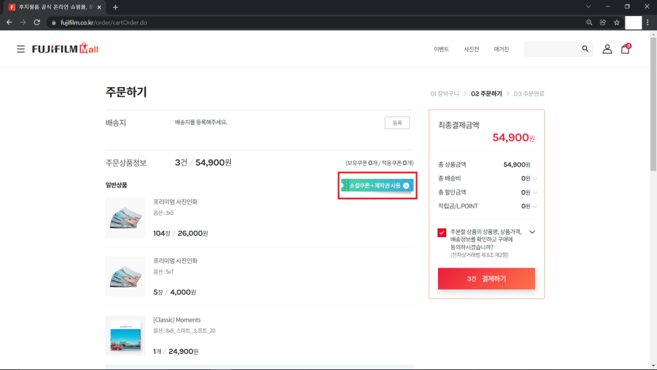 소셜 커머스에서 포토북 쿠폰을 구매하면 후지필름 사이트에 등록할 수 있는 쿠폰 번호가 발급되는데 이를 후지필름 사이트에 등록하고 포토북을 제작하면 된다.
