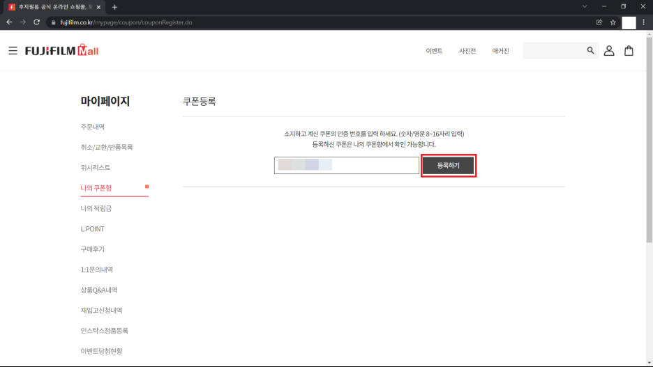 4. 구매한 쿠폰 입력 후 등록하기 클릭