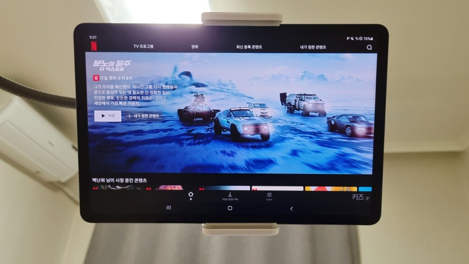 너무나 당연한 얘기지만 침대 태블릿 거치대를 설치한 후 일단 팔이 아프지 않아서 좋다. 폰이든 태블릿이든 끼워주면 조작할 때 외에는 계속 들고 있지 않아도 되니 편하게 영상을 감상할 수 있다.