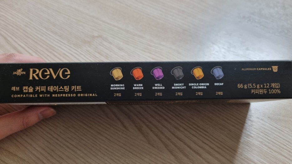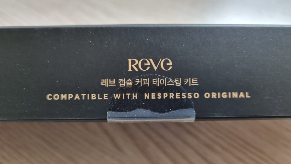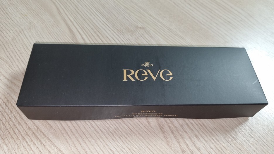 쟈뎅 로고와 브랜드 명인 '레브(REVE)'가 금색으로 표시되어있다. 크기는 가로 약 25cm, 세로 약 7cm 정도. 그리고 상자가 열리지 않도록 테이프로 잘 밀봉되어 있고, '네스프레소 오리지널과 호환됨(Compatible with Nespresso Origin)'이라고 적혀있다.