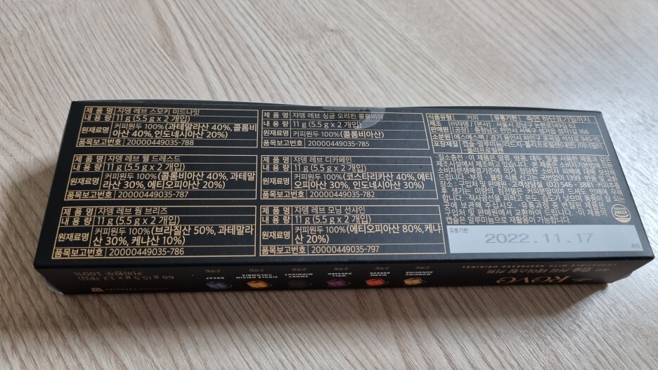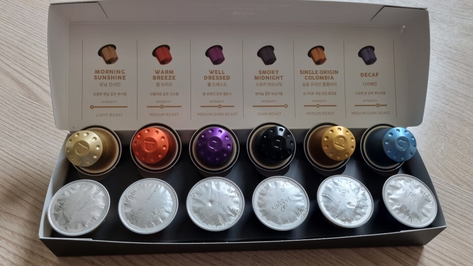 상자를 열면 캡슐의 맛과 향, 강도(Intensity), 로스팅(Roasting) 정도를 한눈에 알아볼 수 있게 정리가 되어 있다. 상자를 열면 알루미늄 부분이 밑으로 되어있지만 캡슐의 색깔을 보여주기 위해서 사진을 찍을 때 뒷줄의 경우에는 캡슐을 뒤집어서 사진 촬영했다.