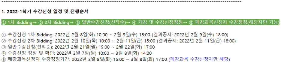 ① 수강신청 1차 Bidding : 2022년 2월 8일(화) 10:00 ~ 2월 9일(수) 15:00 (결과공지: 2022년 2월 9일(수) 18:00)