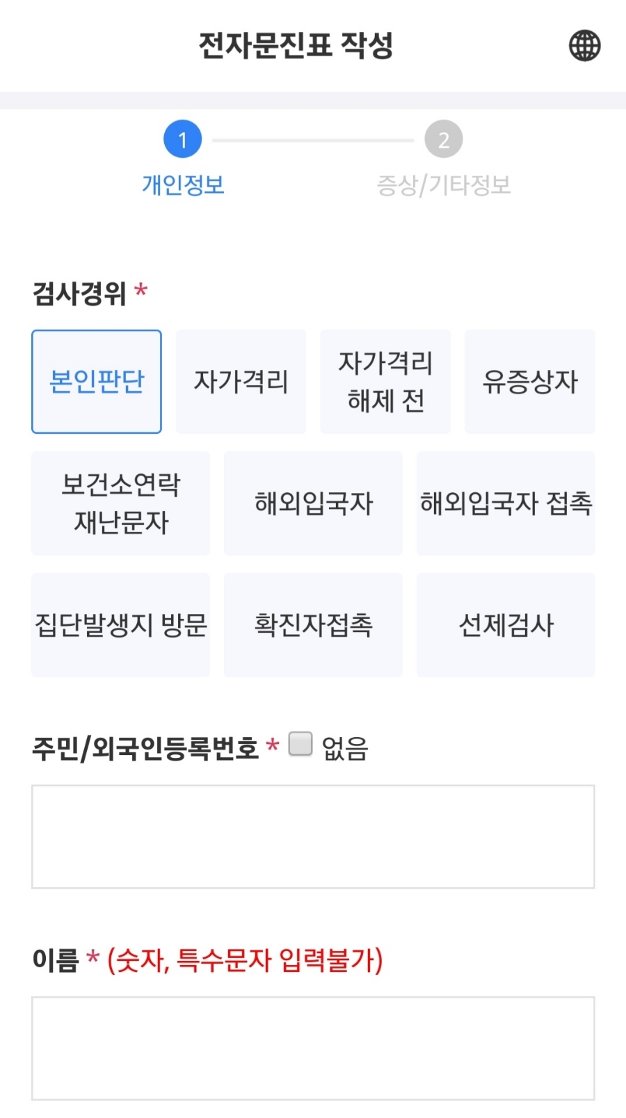 전자문진표는 의례 그렇듯 개인 신상정보(이름, 연락처, 주소 등)을 입력하고 현재 증상을 입력하게 되어있다.