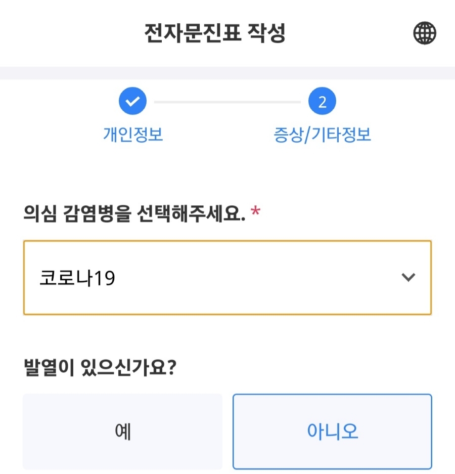 병원 문진표와 달리 증상별로 자세하게 입력할 수 있게 되어있는데 나의 경우 당시 무증상이기 때문에 무증상으로 표시했다.