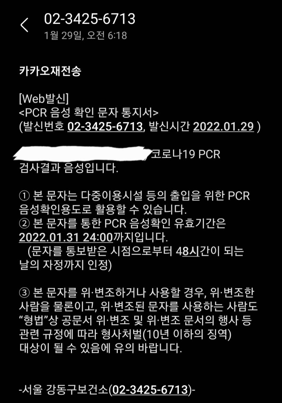 다음 날 새벽 6시 10분쯤에 카톡과 문자로 PCR 검사 결과를 통보받았다. 다행히 음성!