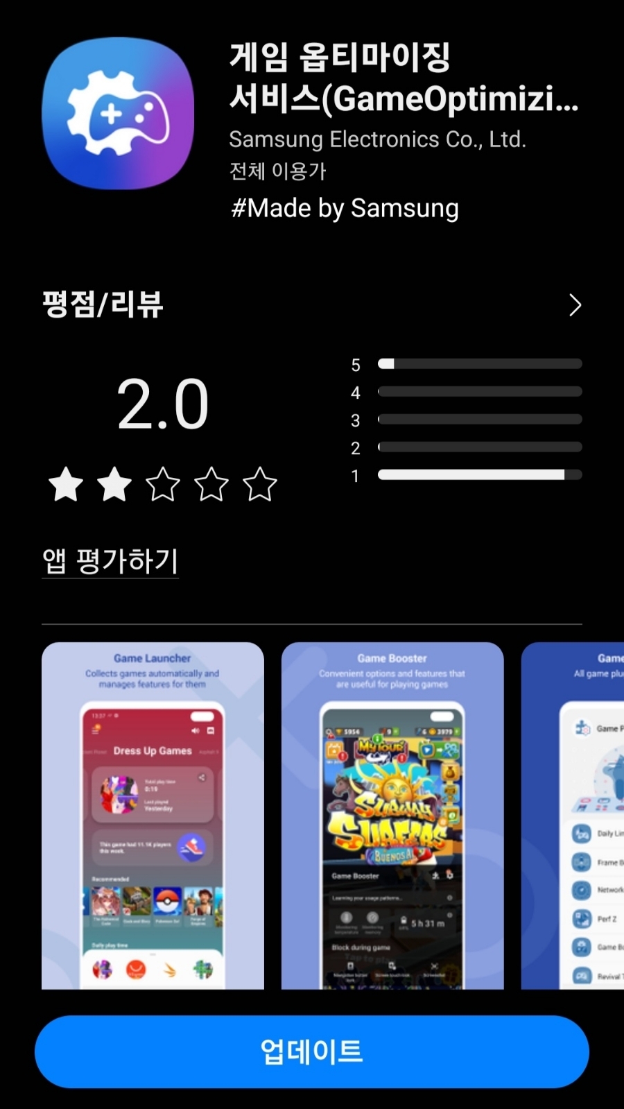 갤럭시 스토어에 들어가니 아니나 다를까 '게이밍 옵티마이징 서비스(Gaming Optmizing Service, GOS)'의 평점이 바닥으로 치닫고 있고, 리뷰 하나하나에 소비자들의 분노가 담겨있다.
