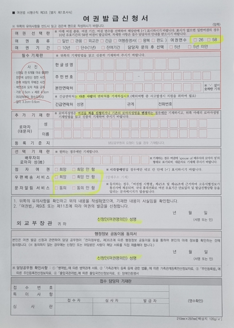 내가 방문한 날은 5월 2일 월요일 오전 11시쯤이었는데 내 앞에 대기인원이 4명 정도 있었다. 여권발급 신청서는 작성해야 하는 항목 중 주의해야 하는 항목에 대해서는 형광펜으로 칠해져 있기 때문에 형광펜으로 칠한 부분은 특히 주의해야 한다.