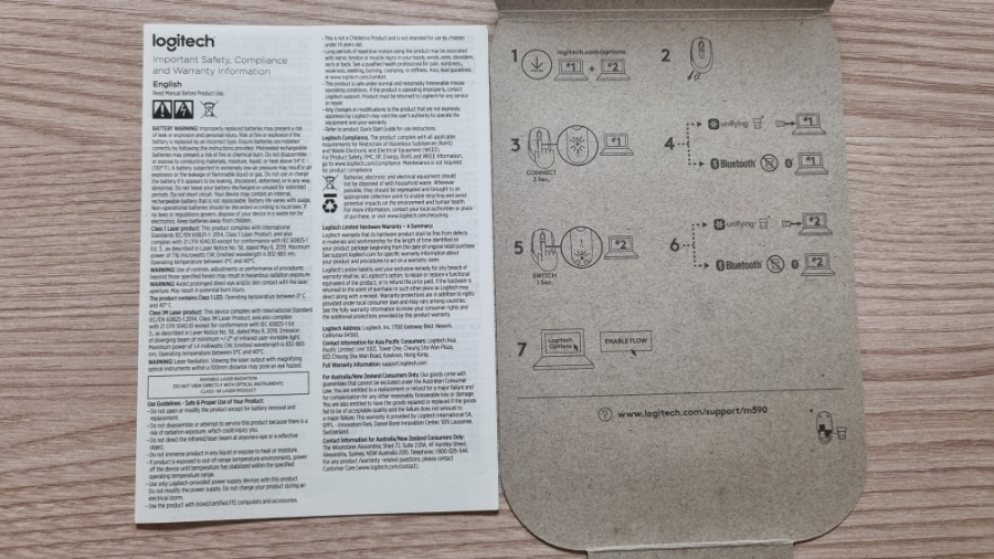 상자를 개봉하면 로지텍(Logitech) M590 멀티 디바이스 무소음 무선 블루투스 마우스와 사용 설명서가 동봉되어 있다. 사용 설명서는 마우스 바닥에 있는 종이를 펼치면 확인할 수 있다.