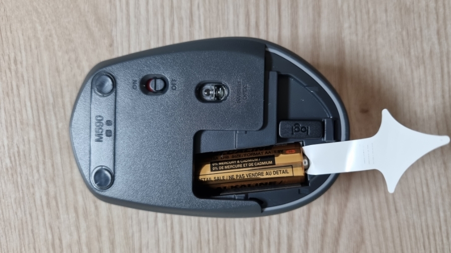 로지텍(Logitech) M590 멀티 디바이스 무소음 무선 블루투스 마우스의 경우 AA 건전지가 포함되어 있기 때문에 별도의 AA 건전지를 구매할 필요가 없고 전류가 통하지 않게 막아둔 화살표 모양의 끈을 당기면 바로 사용할 수 있다.