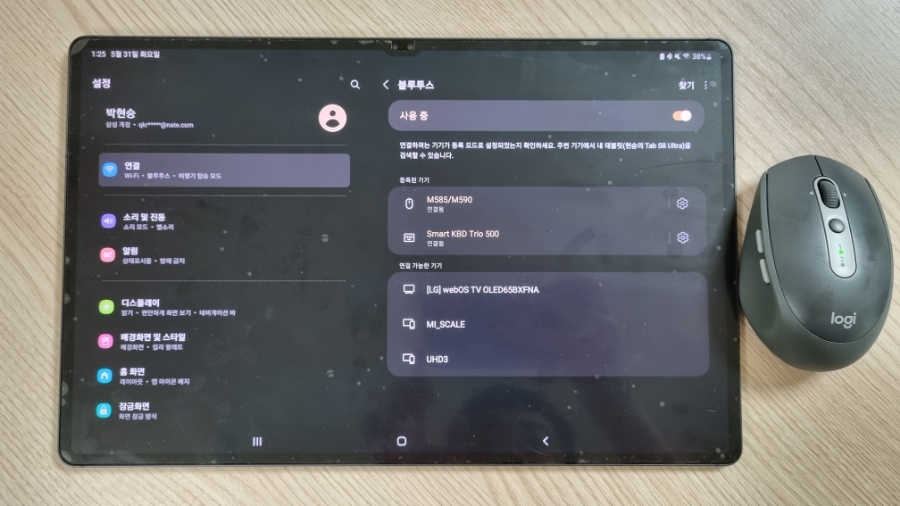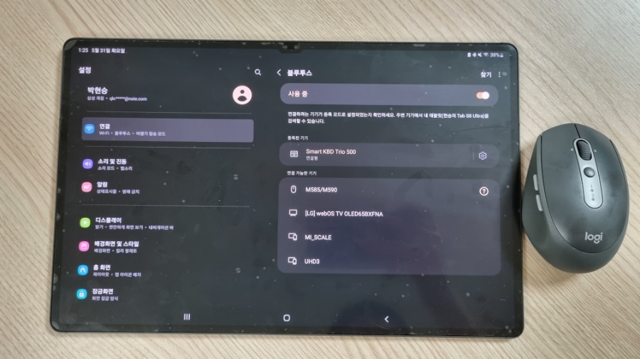 그래도 혹시 모르니 테스트를 위해서 갤럭시 탭 S8 울트라(Galaxy Tab S8 Ultra)에 블루투스 키보드(삼성 Smart Keyboard Trio 500)을 연결한 상태에서 M590을 연결해 보았다.