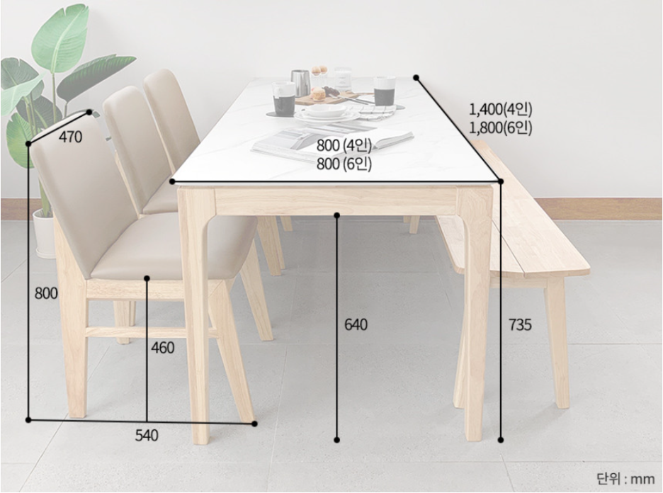 의자는 고민을 하다가 일반 의자를 선택했는데 벤치형 의자가 공간 절약이 되는 장점은 있지만 두 명이 앉거나 일어날 때 동시에 일어나지 않는 한 매번 의자를 움직여야 하는 불편함이 있어서 일반 의자를 선택했다.