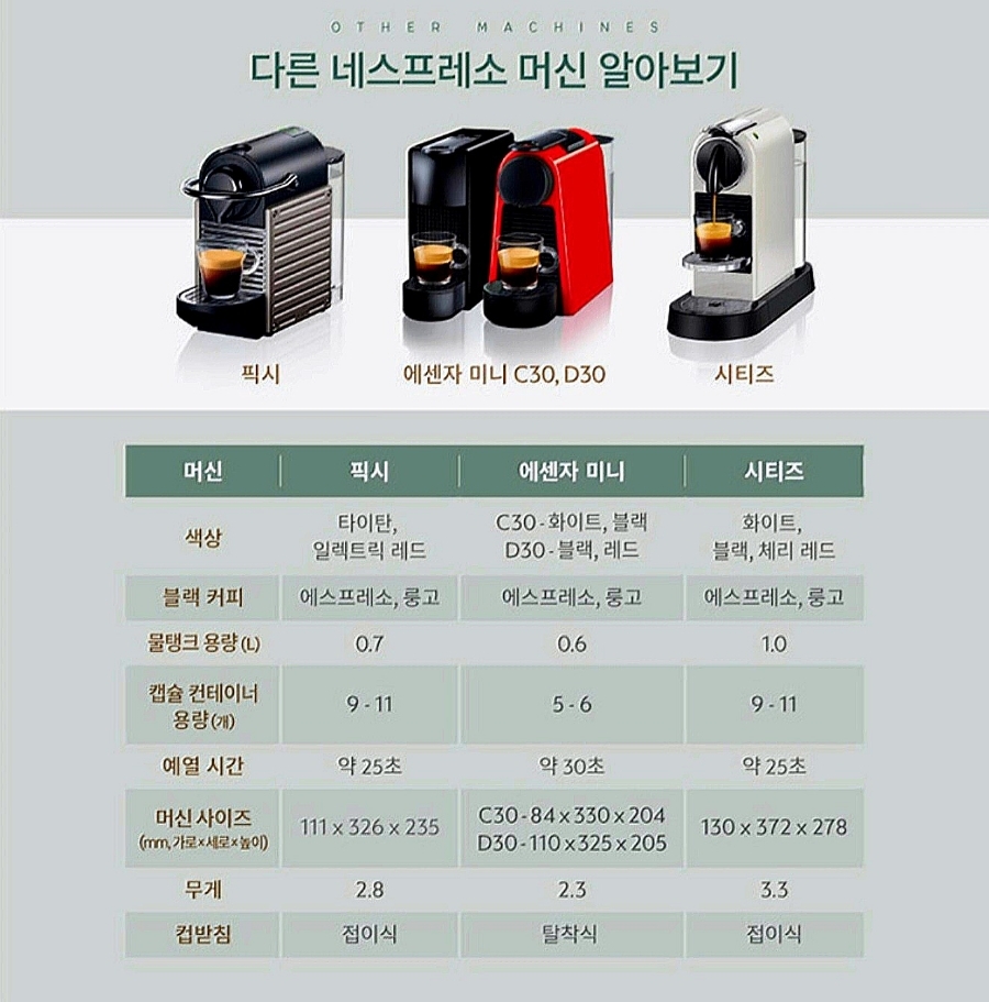 네스프레소 오리지널 커피 머신은 크게 '에센자 미니(Essenza mini)', '픽시(Pixie)', '시티즈(Citiz)' 세 개 모델로 나뉘는데 차이점은 아래와 같다.