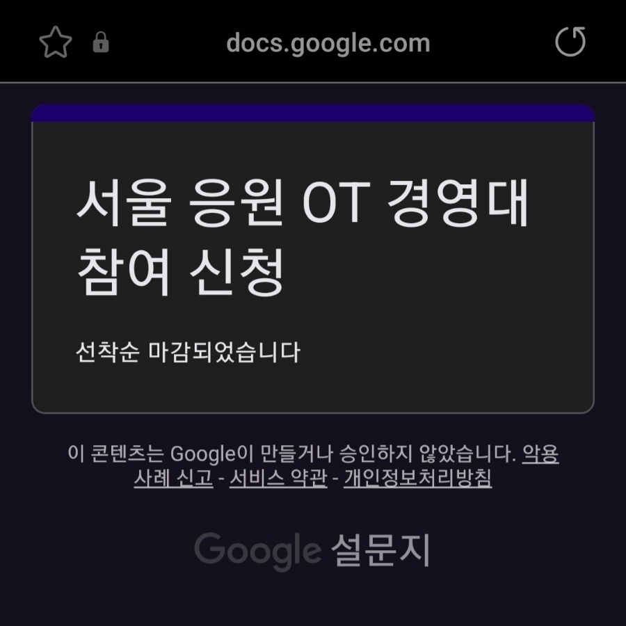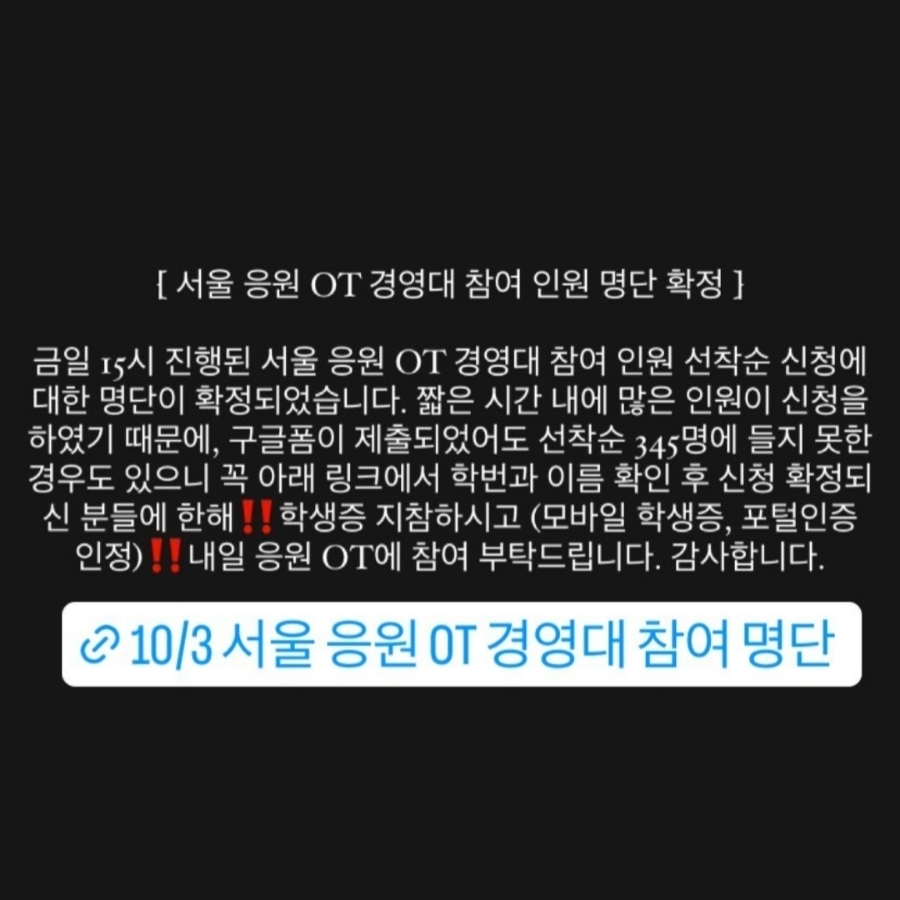 오늘(10월 2일) 오후 3시가 되자마자 공유된 구글 설문에 이름과 학번을 입력하고 결과를 기다리고 있었다. 다른 KMBA 및 FMBA 원우들 이야기를 들어보니 1분 만에 응원 OT 설문이 마감되었다고 하니 응원 OT를 참여를 희망하는 인원들이 많았음을 알 수 있었다.