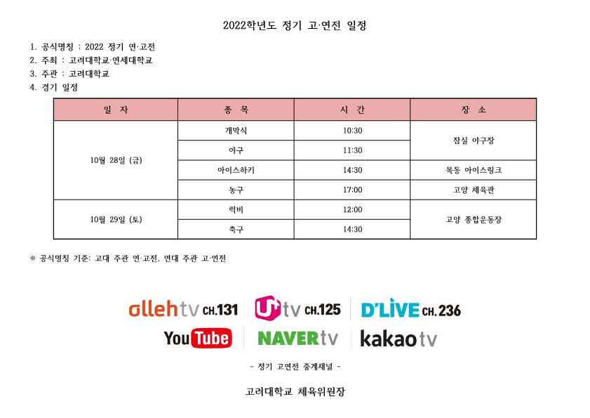 10월 11일 화요일, 2022년 정기고연전(정기연고전) 일정 및 확정!