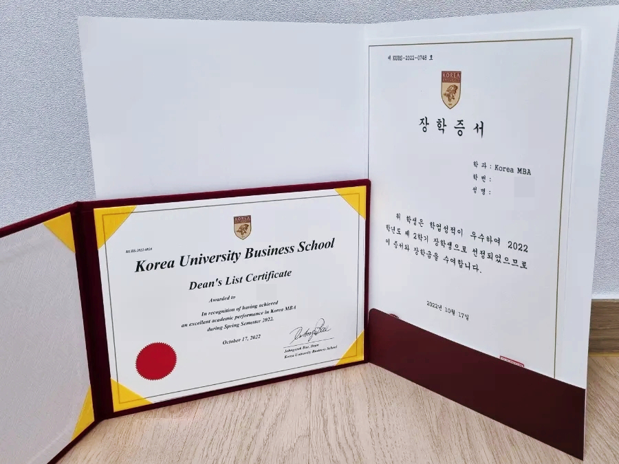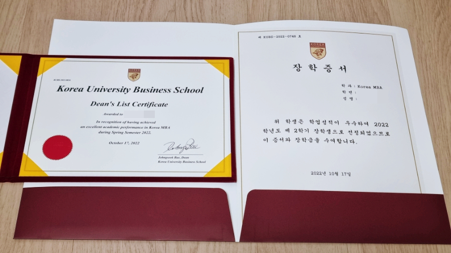 쉬는 시간을 이용하여 경영전문대학원 행정실을 방문하여 꿈에 그리던 Dean's List와 성적우수 장학증서를 수령하였다. 쟁쟁한 Korea MBA(KMBA) 원우님들 사이에서 상위 10% 안에 든 나 자신이 정말 뿌듯하고 대견하다.