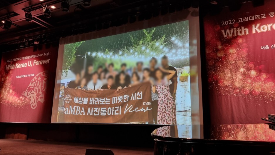 만찬 시간 동안 2022년 고려대학교 경영전문대학원 Korea MBA(KMBA) 생활들을 담은 사진들이 무대 화면에 지나갔는데 마침 내가 운영진으로 활동했던 고려대학교 경영전문대학원 Korea MBA(KMBA) 사진동아리 'ViewFinders(뷰파인더스)' 사진이 눈에 띄어서 몇 장 찍어보았다.