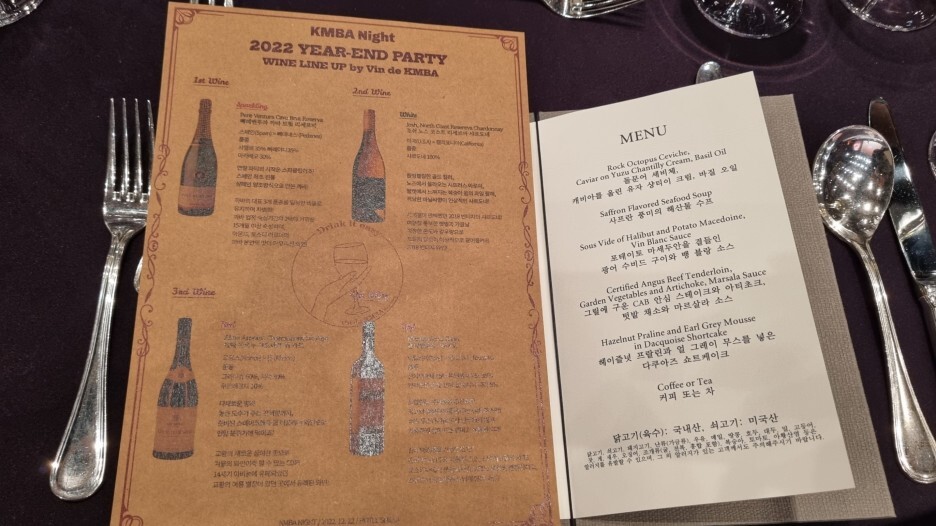 보통의 행사는 호텔 하우스 와인을 택하는데 뜻깊은 2022 KMBA Night(큼바 나잇)을 위해서 고려대학교 경영전문대학원 Korea MBA(KMBA) 104대 학생회와 KMBA 와인동아리 Vin de KMBA(뱅드큼바)가 협업하여 하우스 와인이 아니라 별도의 와인을 따로 선정하였다.