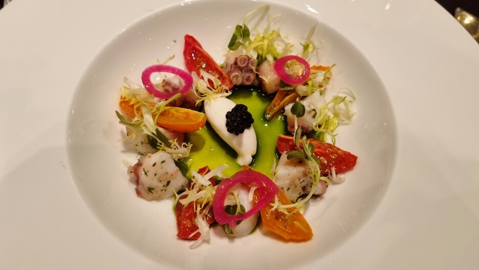 1) 돌문어 세비체, 캐비아를 올린 유자 샹티이 크림, 바질 오일