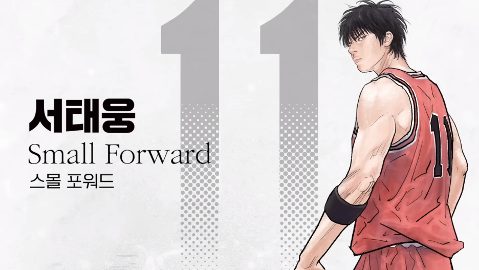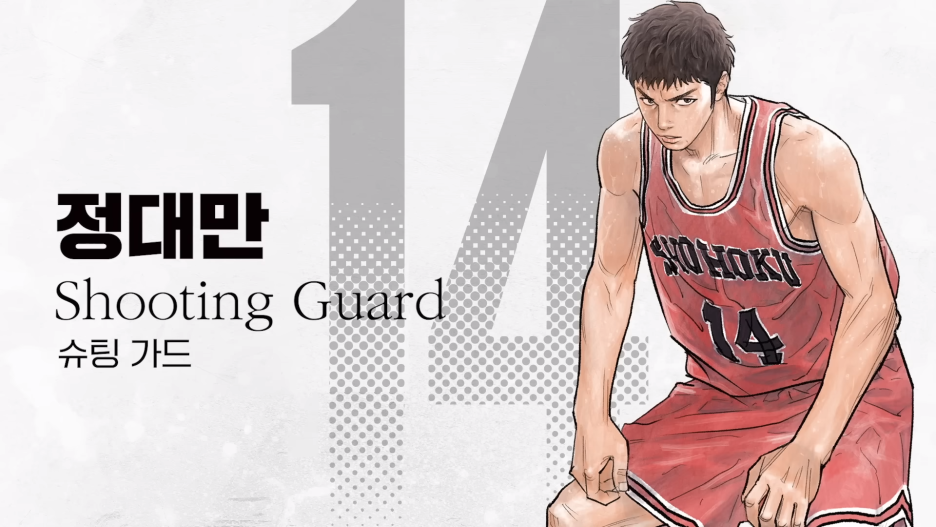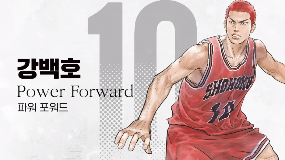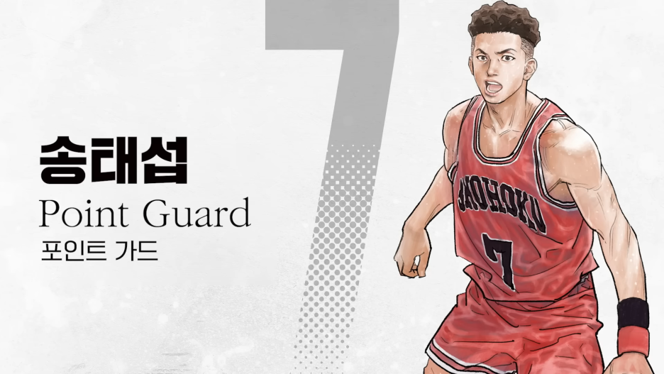 처음엔 더 퍼스트 슬램덩크의 주인공인 송태섭, 그다음은 북산의 주장 채치수, 불꽃남자 정대만, 슈퍼 루키 서태웅, 그리고 슬램덩크의 주인공 강백호.