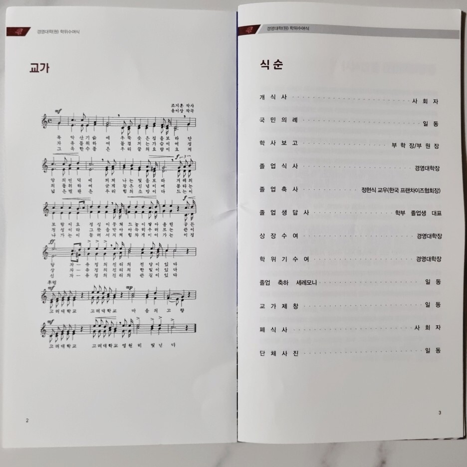 식순은 아래 팸플릿 사진대로 개식사 - 국민의례 - 학사보고 -졸업식사 - 졸업생 답사 - 상장 수여 - 학위기 수여 - 졸업 축하 세리머니 - 교가 제창 - 폐식사 - 단체 사진 순서였다. 역시 고려대학교 행사답게 교가 제창이 있다.
