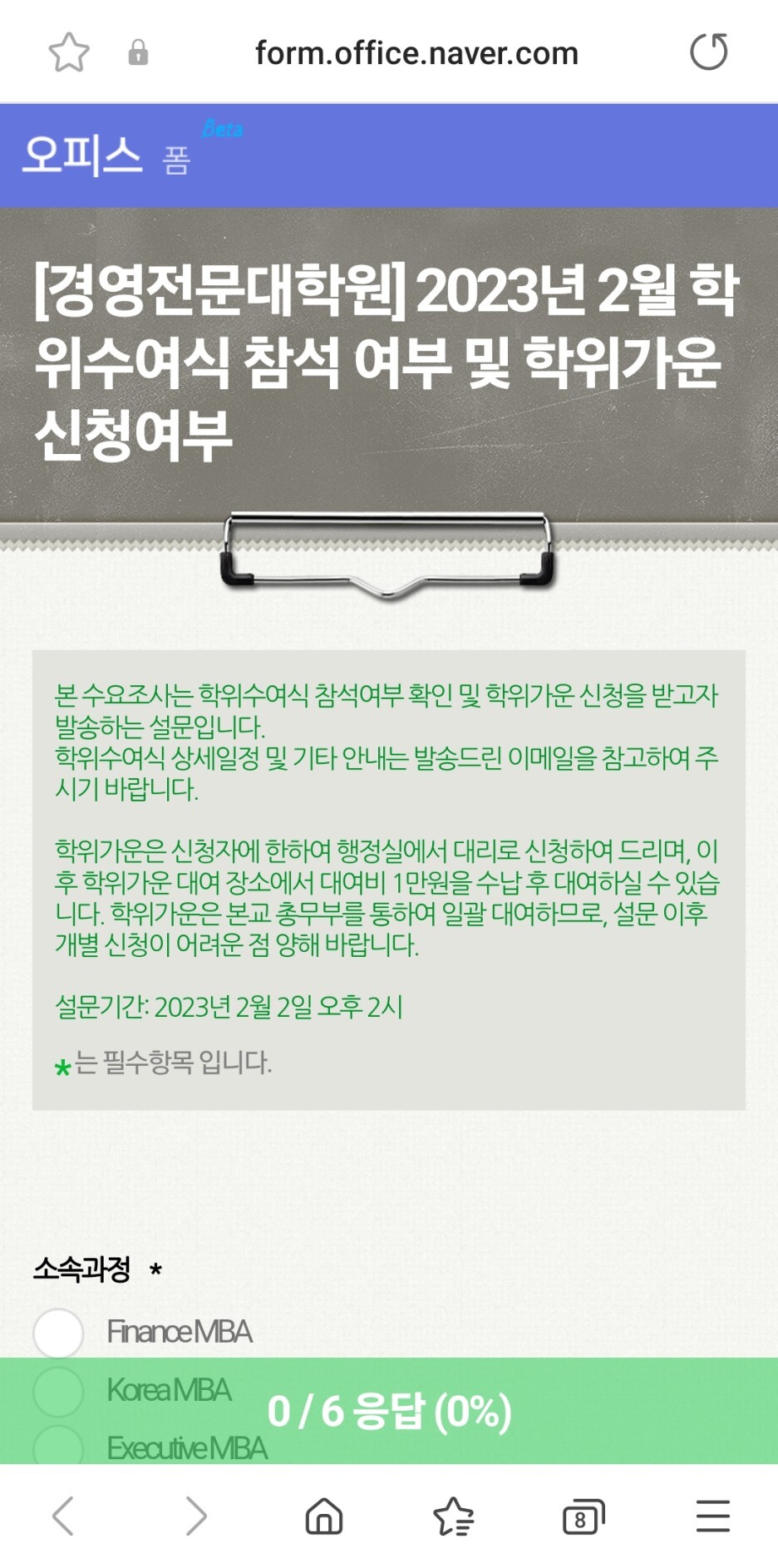 졸업 사정에는 졸업 가능 여부와 더불어 2023년 고려대학교 경영전문대학원 졸업식 참석 여부와 학위복(학위 가운) 대여를 신청할 수 있는 링크가 있었다.