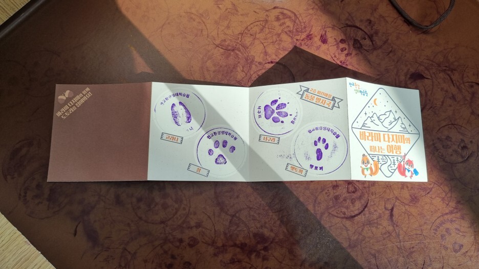 앞면에는 1층 초록마을, 2층 파란마을과 하얀마을 도장(스탬프)를 찍게 되어있고, 뒷면에는 성남시에 살고 있는 동물 발자국들 도장을 찍을 수 있다. 그리고 단순히 도장만 찍으면 아이들의 흥미가 떨어지니 간단한 도토리 종이접기 방법까지 포함되어 있었다.