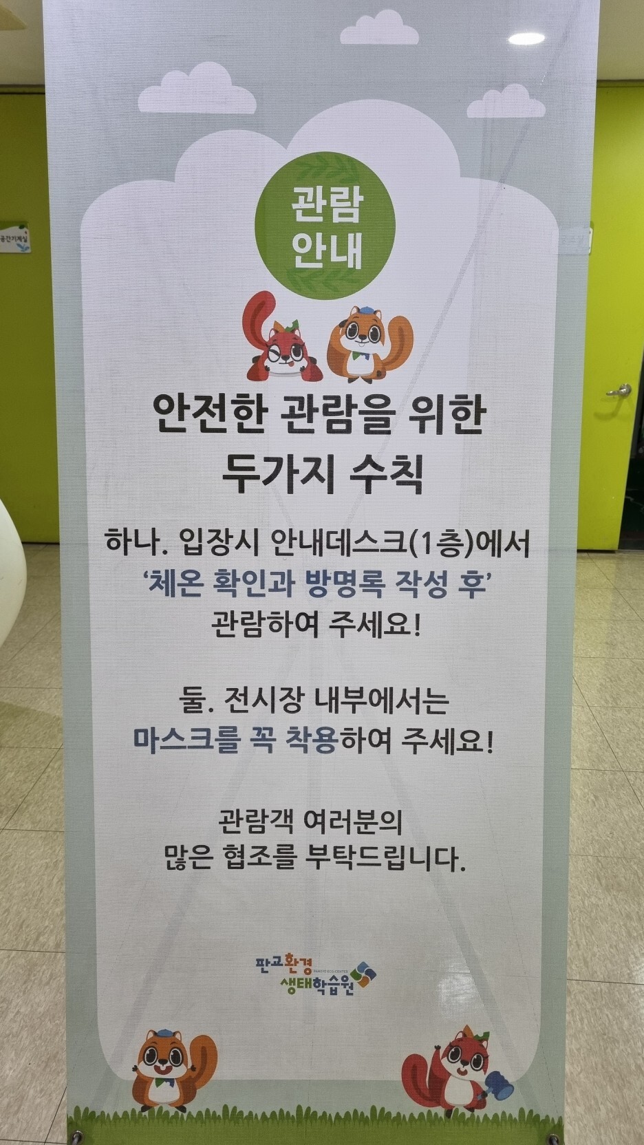 2023년 1월 당시에는 실내에서 마스크를 착용해야 했기 때문에 마스크 착용과 체온 측정 안내 X 배너가 크게 있었다. 녹색 문을 지나 왼편의 엘리베이터를 타고 1층으로 올라가서 안내 데스크에 차량 등록을 했다. 차량 등록을 한 후에는 아이들이 판교환경생태학습원을 재밌게 구경할 수 있도록 도장(스탬프)를 모을 수 있는 종이를 나눠주셨다.