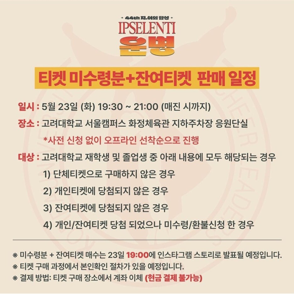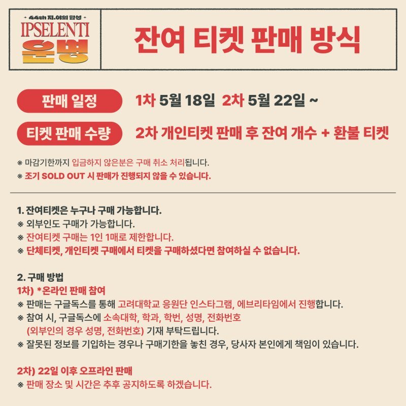4. 잔여 티켓 판매 1차(잔여수량이 있을 경우) : 대상 변경 전 모두(일반인도 구매 가능) → 변경 후 고려대학교 재학생, 휴학생, 수료생, 졸업생