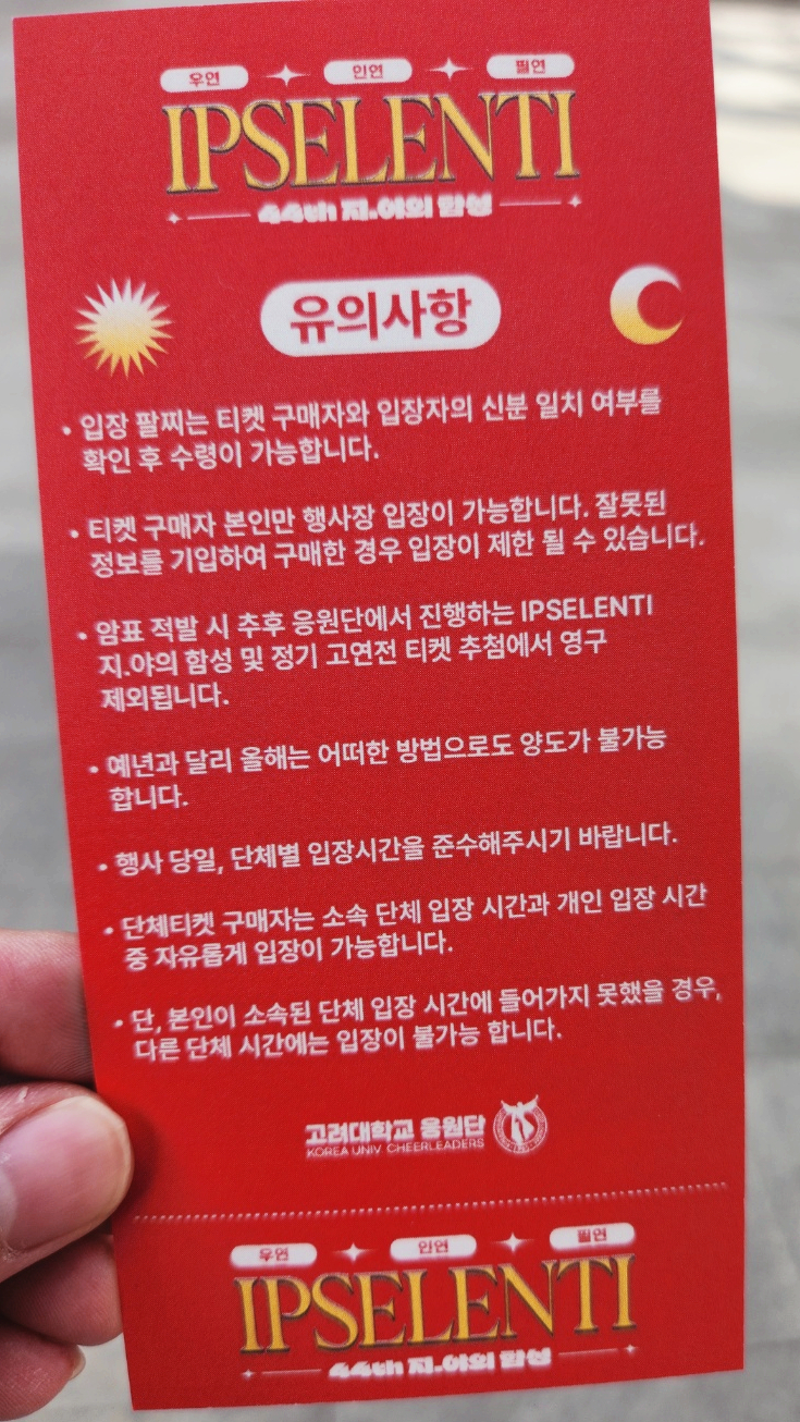 그렇다면 그분들을 위해서 작은 팁을 드리자면 입실렌티는 다른 대학교 축제와 달리 '응원'이 핵심이기 때문에 고려대학교 응원곡과 응원 동작을 알고 가시는 것이 좋다. 아래 2021년, 2022년 고려대학교 응원 OT 유튜브 영상을 보고 주요 응원곡들의 응원 동작을 미리 연습해 보면 좋다.