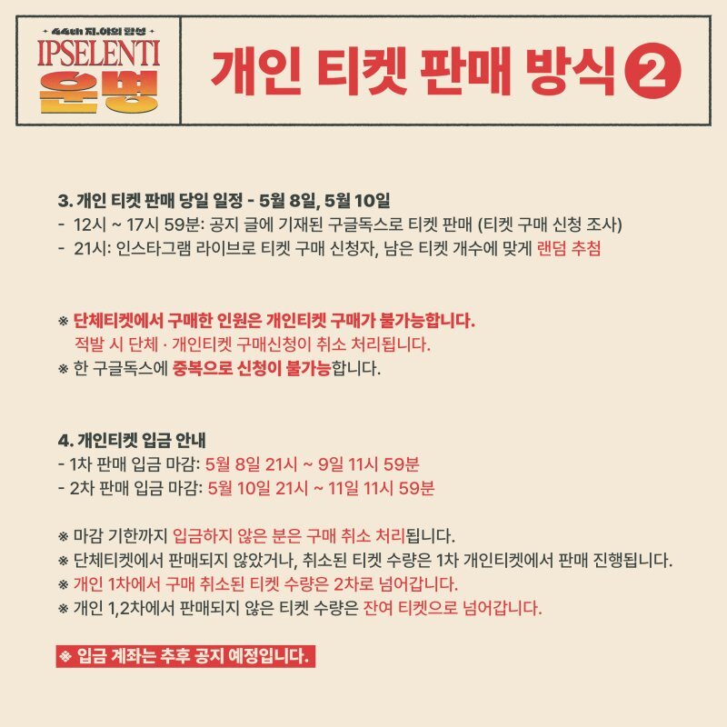 공지를 읽어보니 1차 개인티켓 당첨자 중에 무려 128명이 시간 내에 입금을 하지 않아 이번 2023년 입실렌티 2차 개인티켓 추점에 계획되어 있던 500장 + 128장이 더해져 총 628명이 선정되었다.