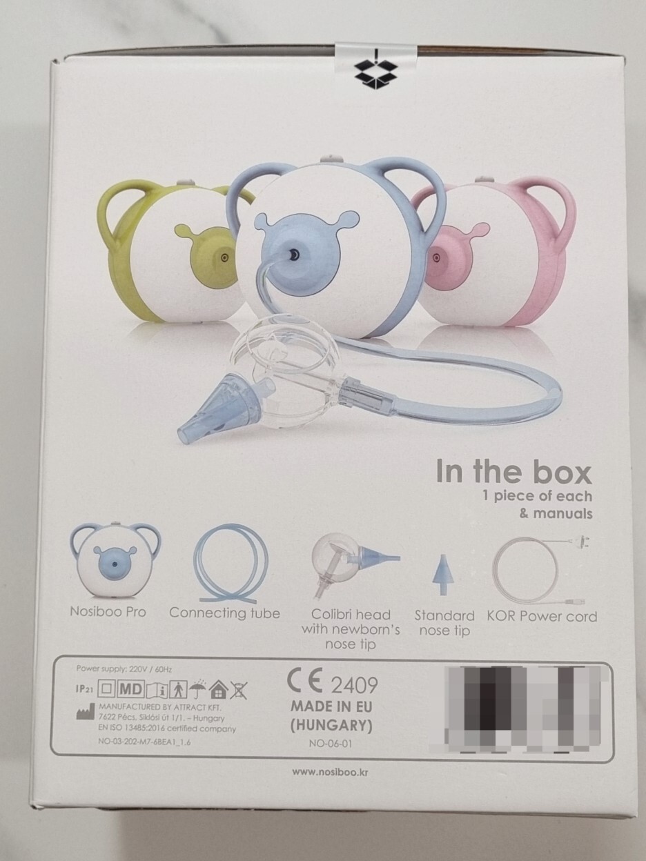 다른 집에서 노시부 프로 콧물흡입기 실물을 본 적이 있긴 하지만 택배 상자가 내가 예상했던 것보다 커서 살짝 놀랐다. 아무래도 구성품이 같이 들어있기 때문에 상자가 큰 것 같다.