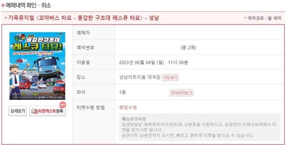 공연 일정은 하루에 총 세 번으로 11시, 14시, 16시 반 공연이 있는데 아무래도 오후에는 뚱주 낮잠 시간이니 오전 11시로 예매를 했고, 티켓은 현장 혹은 우편 수령이 가능한데 뚱주가 장소에 익숙해지도록 미리 갈 예정이라서 현장 수령으로 예매했다.