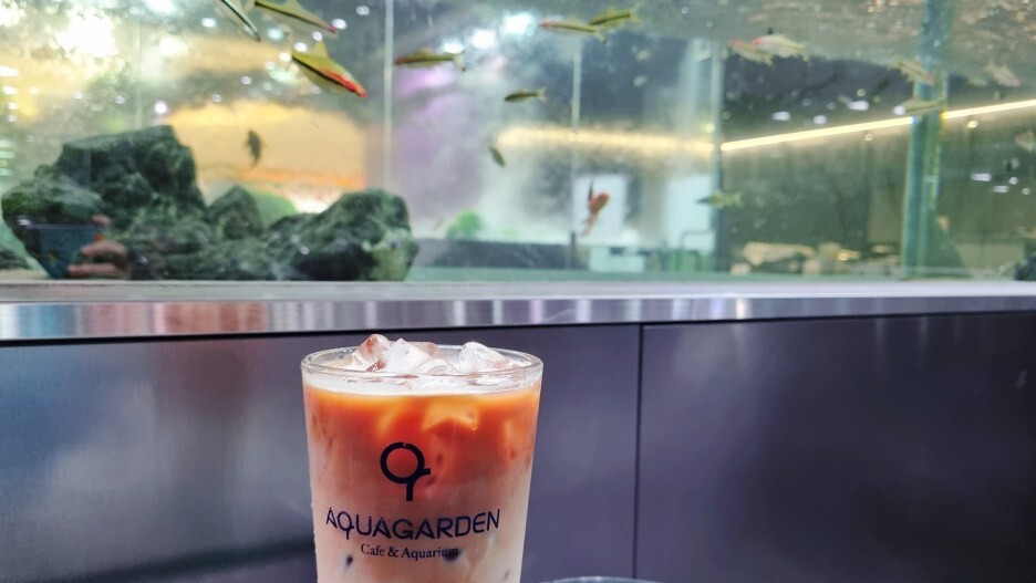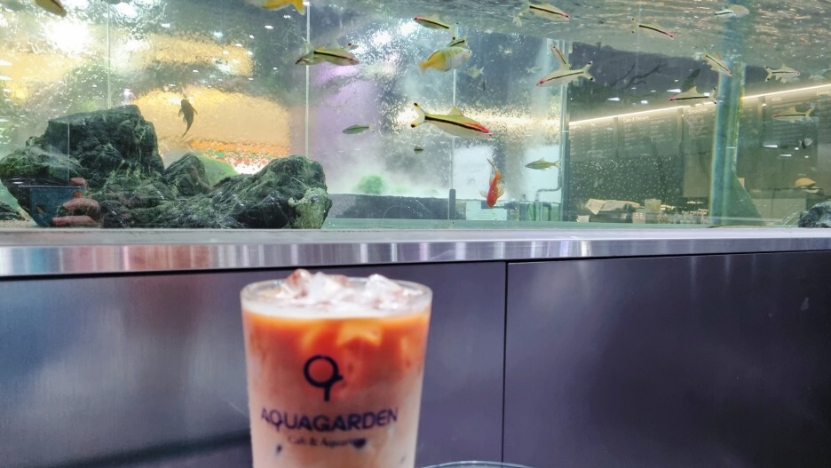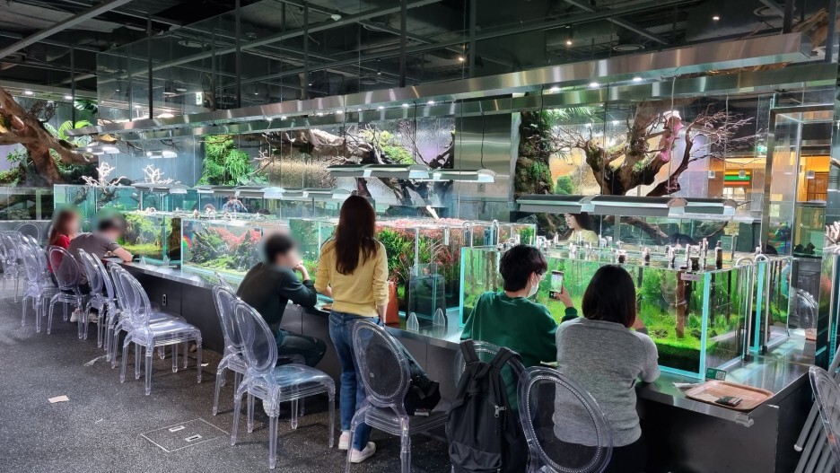 카페에 들어가서 주문을 하고 자리를 잡으면 되는데 인기 있는 자리는 위 두 번째 사진처럼 수족관이 자리 바로 앞에 있어서 앉아서 작은 물고기를 구경할 수 있는 자리가 인기가 많다.