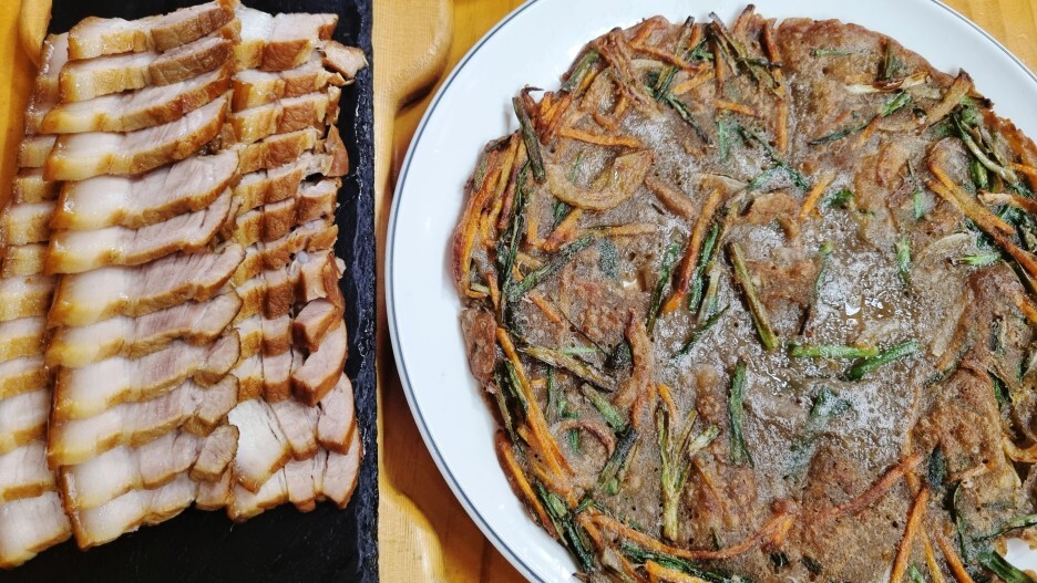 아쉽지만 뚱주가 먹을 수 있는 수육과 메밀전을 시키기로 했다.