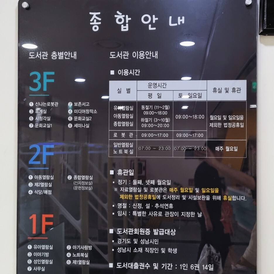 - 유아/아동열람실 & 정보실 : 3월 ~ 10월 오전 9시 ~ 오후 8시(20시) / 11월 ~ 2월 오전 9시 ~ 오후 6시(18시)