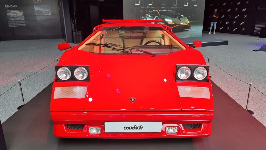 람보르기니 60주년 팝업 라운지를 들어서면 왼쪽에는 빨간 람보르기니 쿤타치가 오른쪽에는 보라색 람보르기니 디아블로가 입장객을 맞이한다.