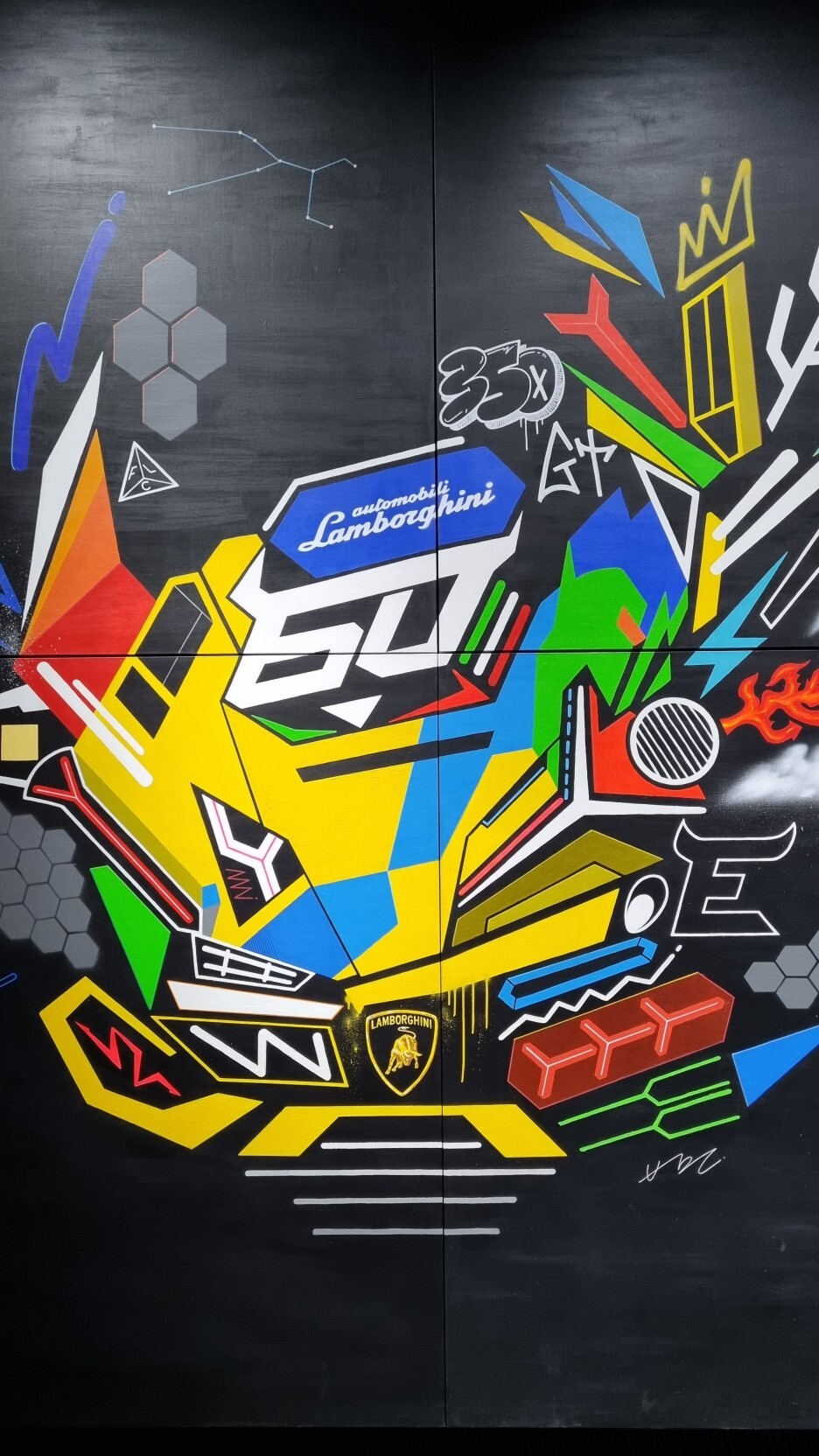 람보르기니 우루스를 구경하고 레이싱 시뮬레이터 옆에 있던 람보르기니 60년 역사를 압축한 그림을 살펴보았다.