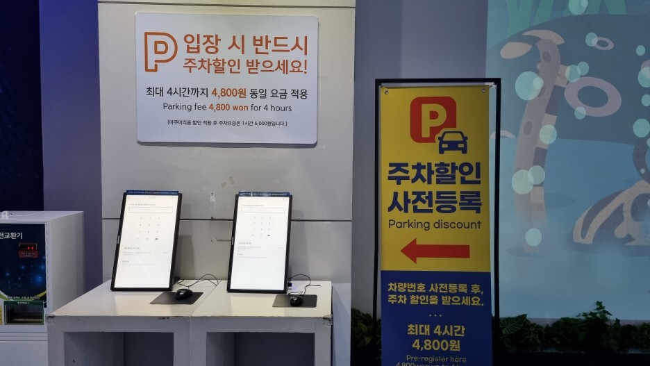 주차 할인 사전등록의 경우에는 아쿠아리움 퇴장 전에 가능했던 것으로 기억이 나는데 퇴장 시 까먹을 수 있으니 입장하면서 미리 주차 할인 사전등록을 하는 것이 좋을 것 같다.