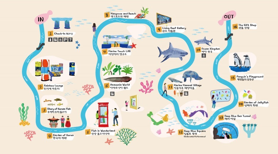 공연을 관람하면 해저터널을 지나 해파리들이 있는 '심해의 화원'이 나오고, 그리고 귀여운 펭귄들이 있는 '펭귄들의 꿈동산'이 나온다.