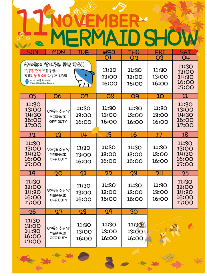 아래는 2023년 11월 코엑스 아쿠아리움 인어수중공연 시간표이다.