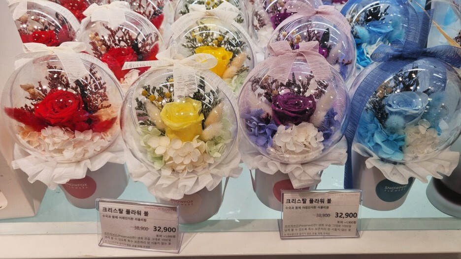 하지만 위에 설명했듯이 내가 필요한 건 부피가 작으면서 의미가 있는 꽃이었기 때문에 직원의 추천으로 대표 사진에 있는 '크리스탈 플라워볼'을 구매하였다.