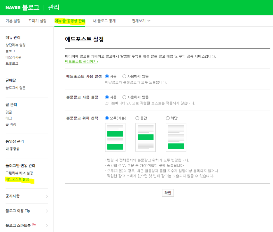 10) 블로그 관리 → '메뉴,글,동영상 관리' 클릭 → 플러그인,연동 관리 '애드포스트 설정' 클릭 후 아래 캡처화면 참고하여 설정을 모두 '사용'으로 변경 (특별한 경우가 아니면 자동으로 설정되어 있음)