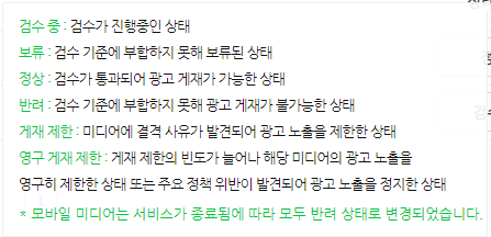 위와 같이 애드포스트의 기준을 만족하지 못할 경우 보류, 반려가 될 수 있다.