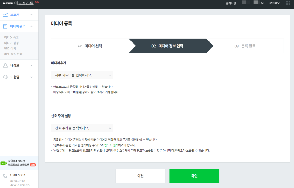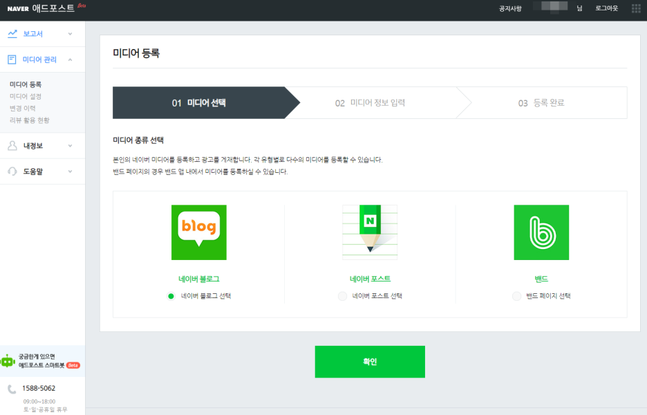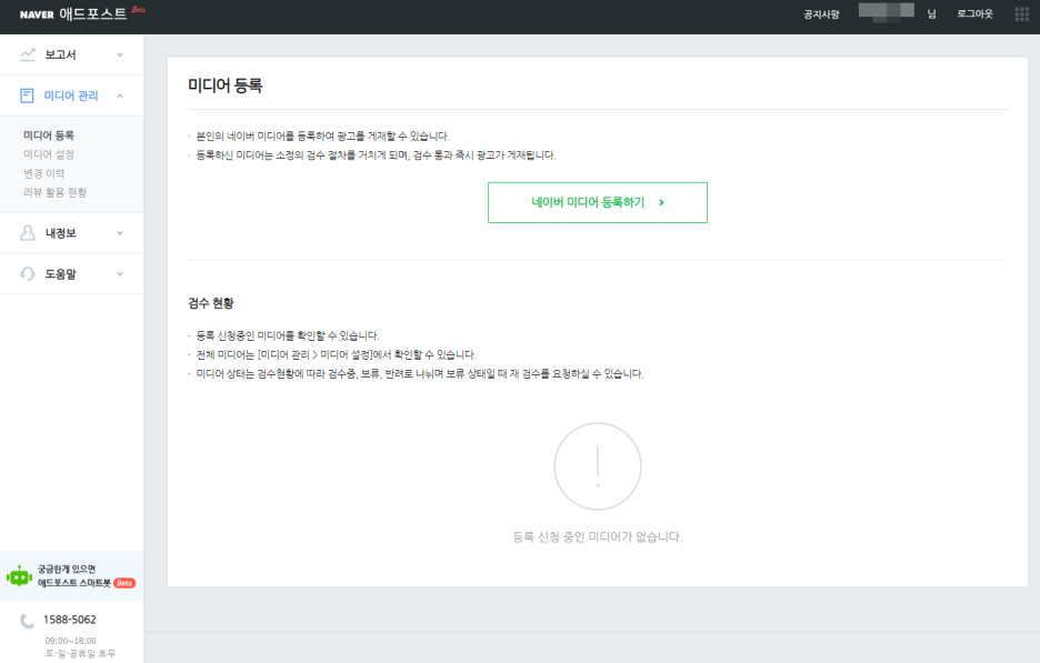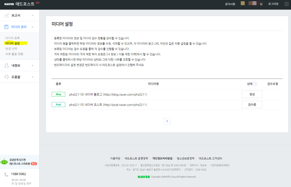 8) 좌측 '미디어 관리' → '미디어 설정' 클릭하여 '접수중' 확인 (애드포스트 미디어 등록 시 자동 메일 발송됨)
