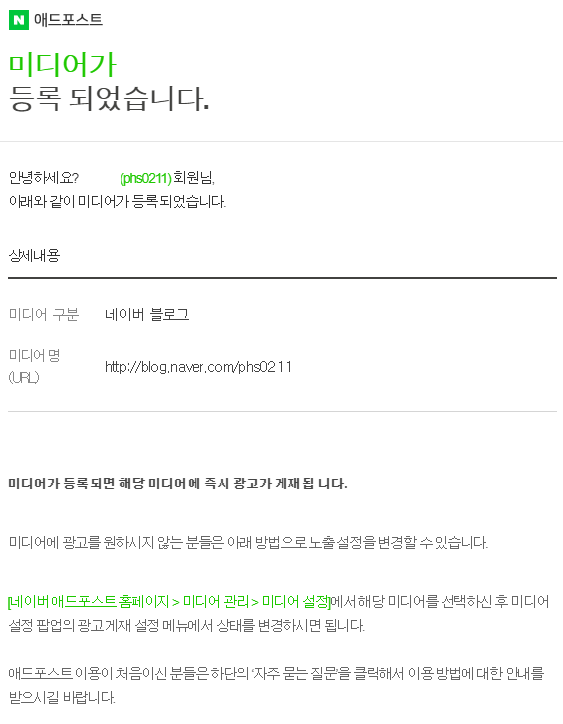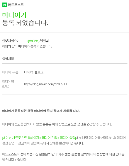 9) 등록 완료 시 "[네이버 애드포스트] 미디어가 등록 되었습니다." 메일 발송되고, 상태가 "정상"으로 변경됨