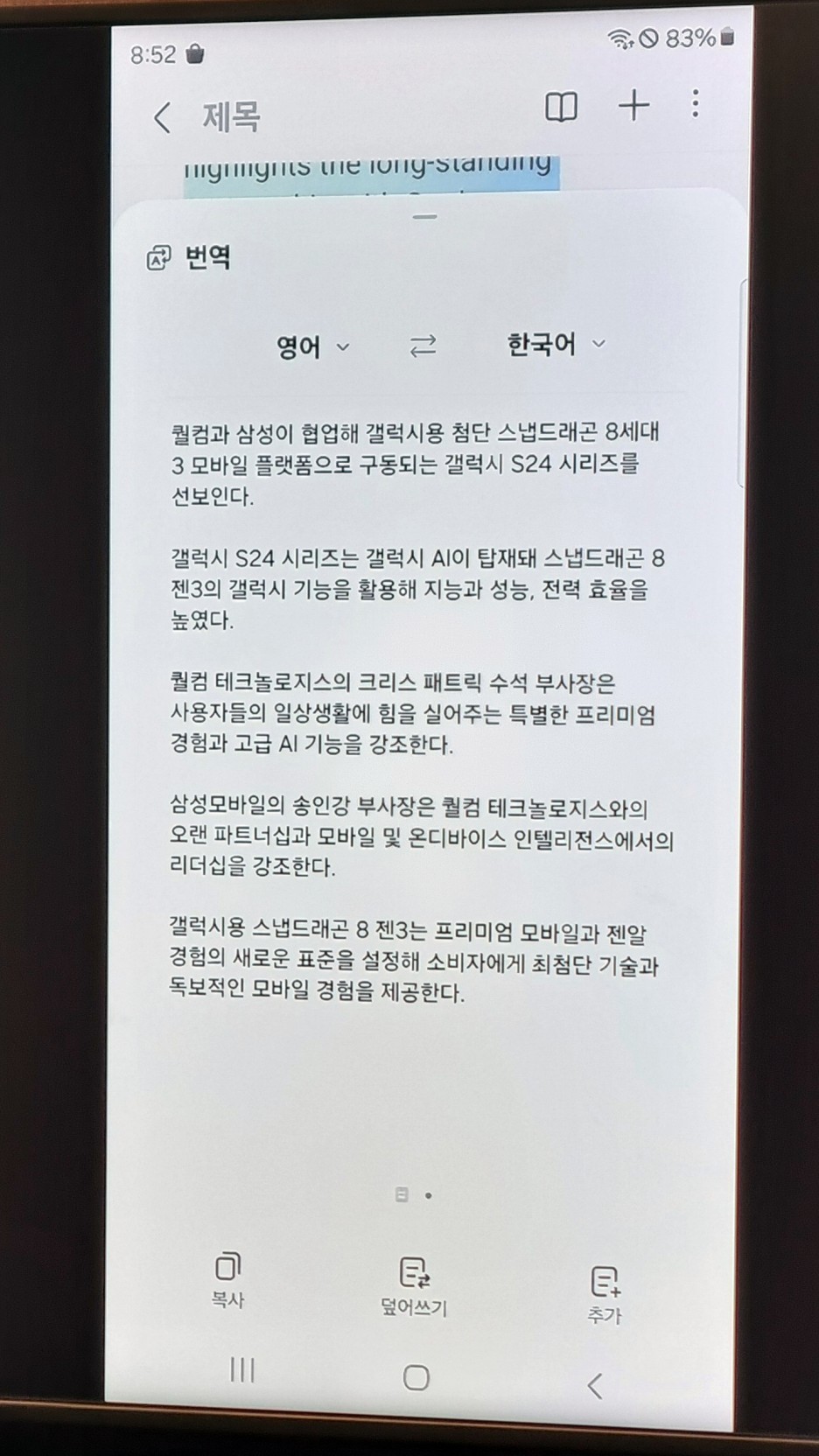 텍스트 촬영 후 번역하는 것은 여행 때 자주 사용하는 기능인데 촬영 후 바로 번역이 되는 것도 놀라웠지만 장문의 글을 간단하게 요약해 주어 아무리 긴 영어 문장이 있어도 쉽게 내용 파악을 할 수 있었다.
