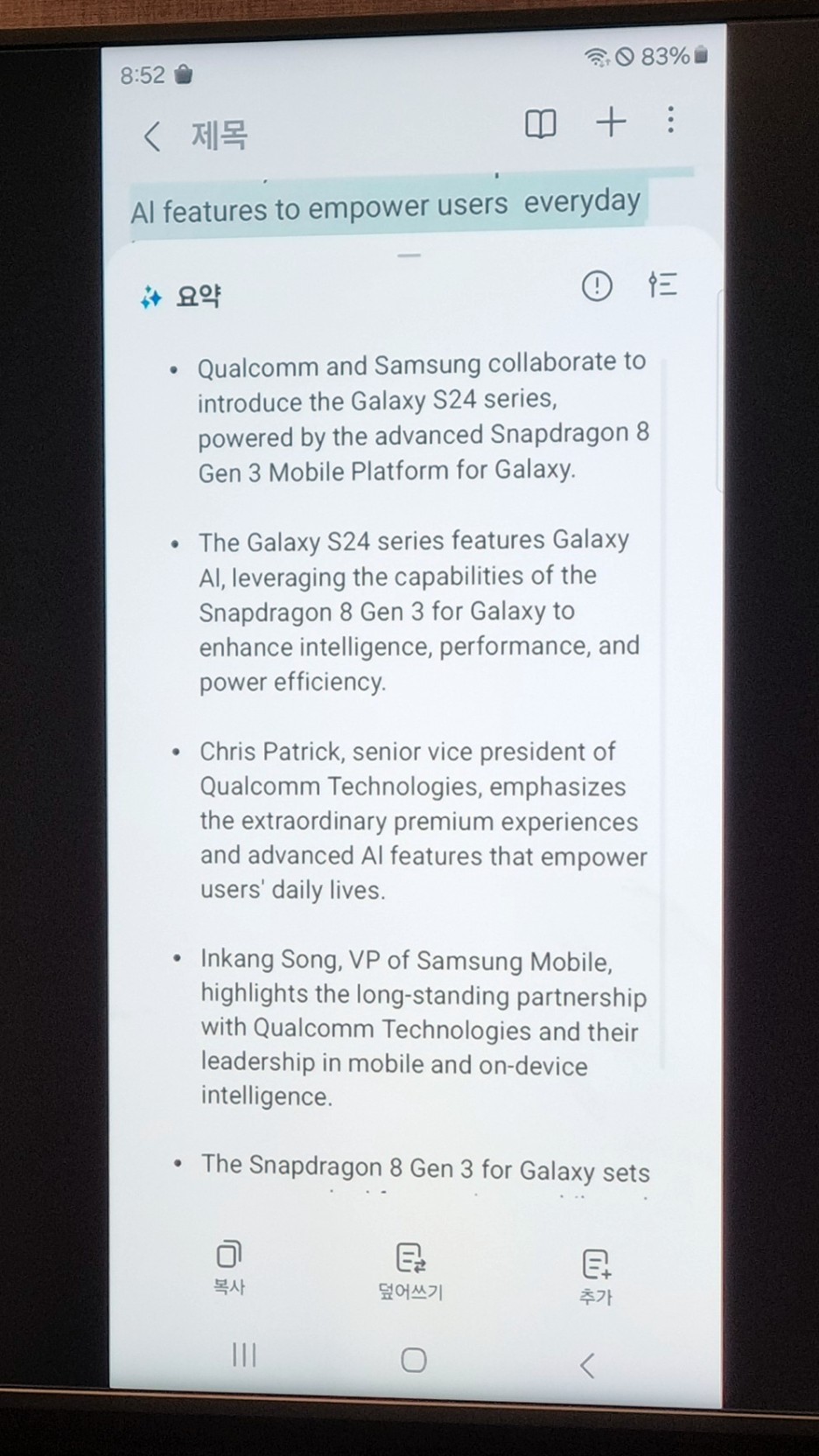 첫 번째 AI(인공지능) 세션은 1) 일상생활 속 AI, 2) 온디바이스 AI, 그리고 3) 스냅드래곤의 강점으로 요약할 수 있었다.